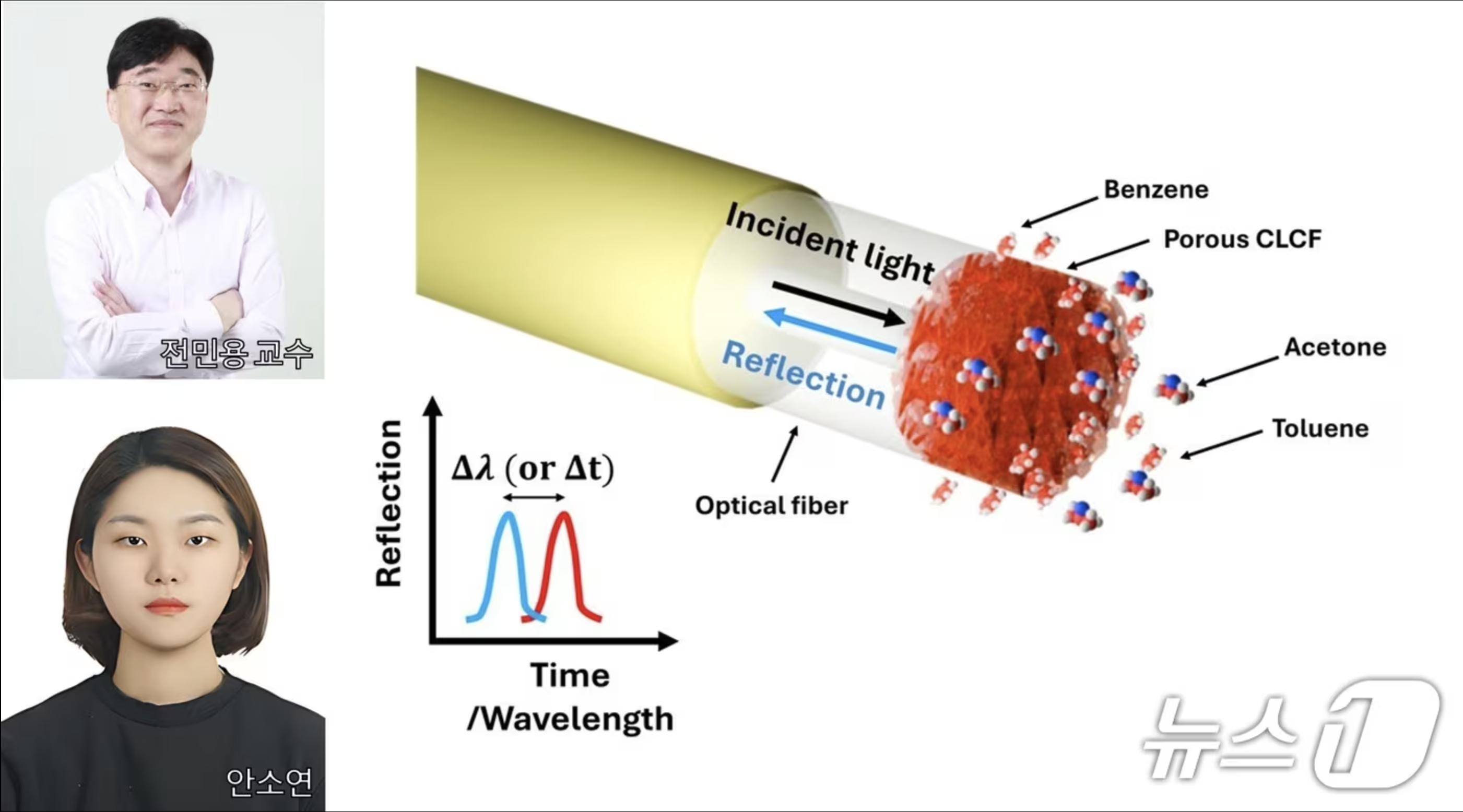 (대전ㆍ충남=뉴스1) 박찬수 기자 = 충남대학교 물리학과 전민용 교수 연구팀이 고농도의 가연성 휘발성 유기 화합물(VOC) 증기를 실시간으로 감지할 수 있는 새로운 광섬유 센서를 개발했다.22일 충남대에 따르면 이번 연구 성과는 국제 학술지 ‘Sensors and Actuators B: Chemical’(IF:7.7, 상위 2.53%)에 8월 13일 온라인 게재되며 연구의 우수성을 인정받았다. 이번 연구는 중점연구소 참여교수인 충남대 김종현, 김문덕 교수와의 공동연구로 진행됐으며, 물리학과 안소연 박사과정이 제1저자로, 전민용 교수가 교신저자로 참여했다.